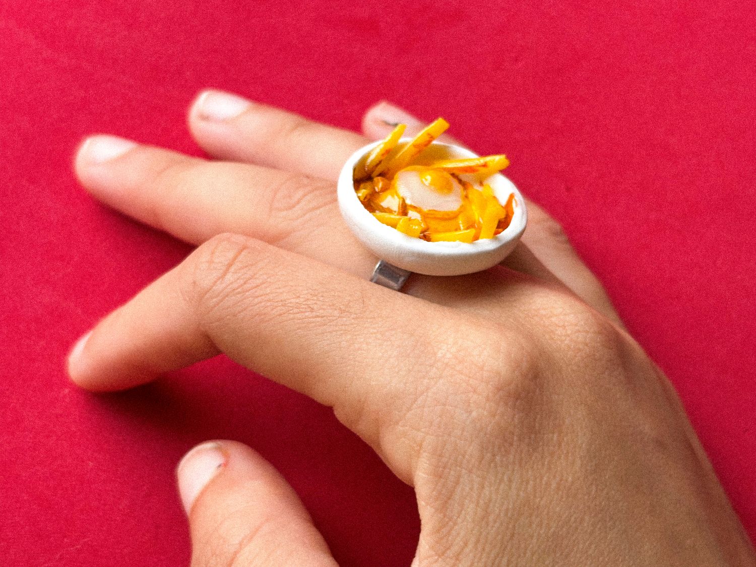 Anel Francesinha 10,00 € Desconto de %. Partilhar Comprar Contactar 1 unidades em stock O anel é feito à mão, por isso vai ser ligeiramente diferente da imagem e diferente todas as vezes que encomendares. Tags francesinhacomidaportuguêsporto Acabamento Vitral Material aço inoxidável e massa de modelagem Esculpido manualmente ✓ Características