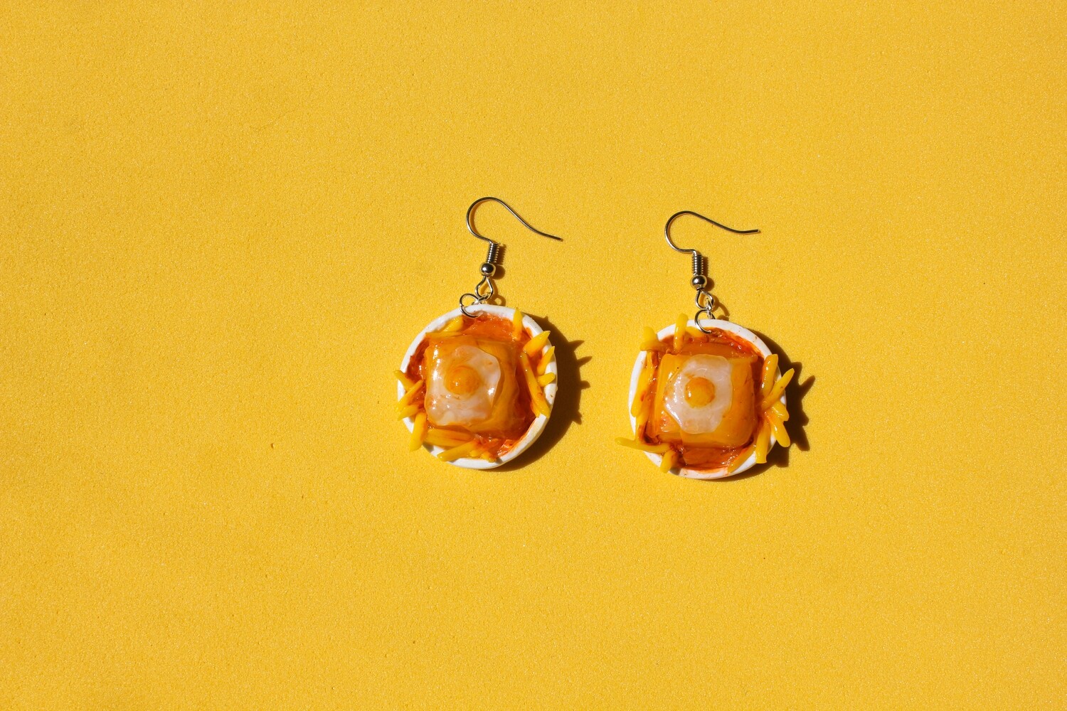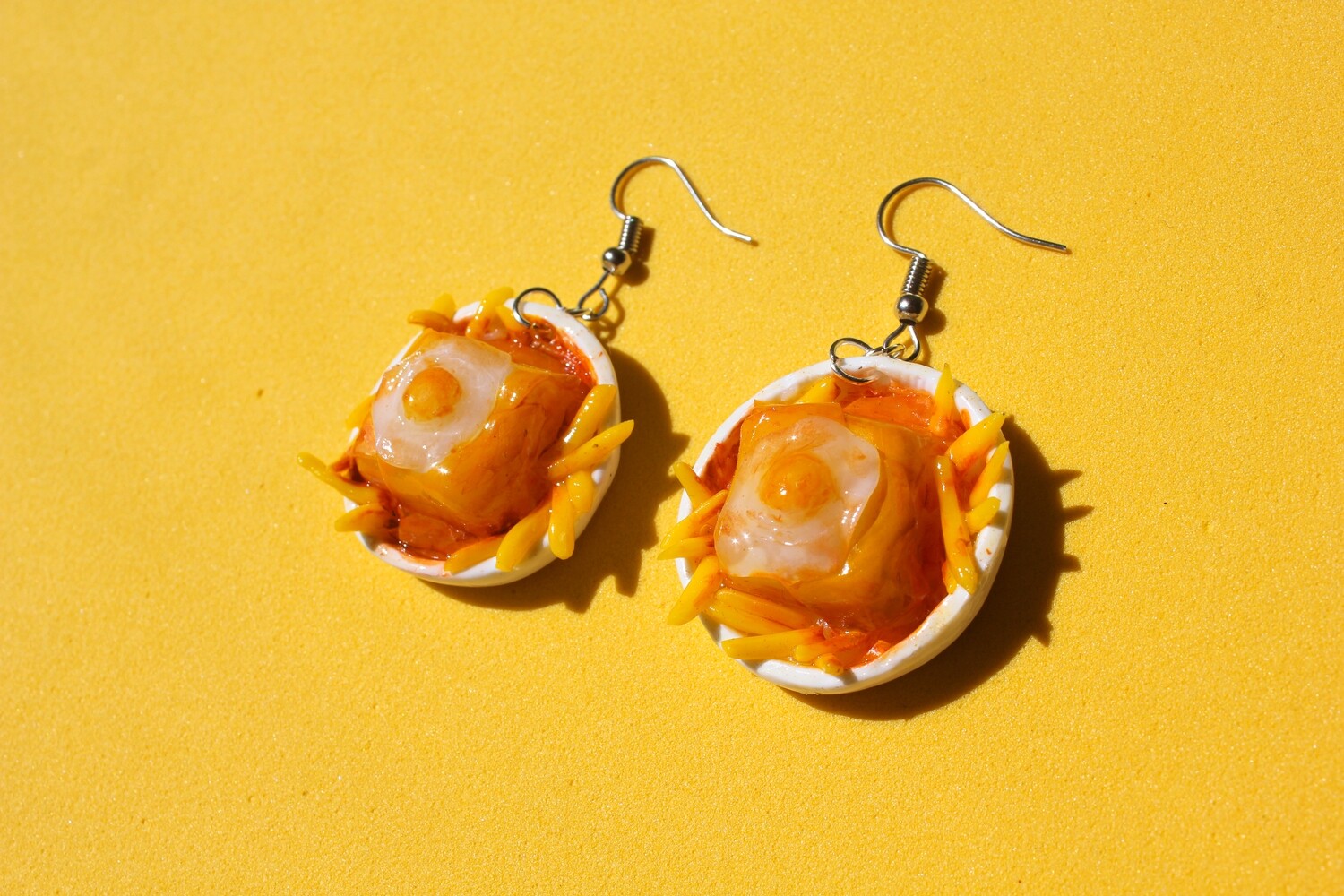 • Brincos com mini pratos de frigideira com ovo e batatas fritas, fundo amarelo