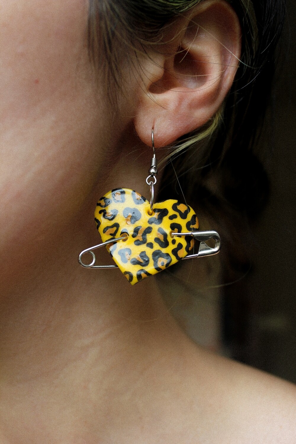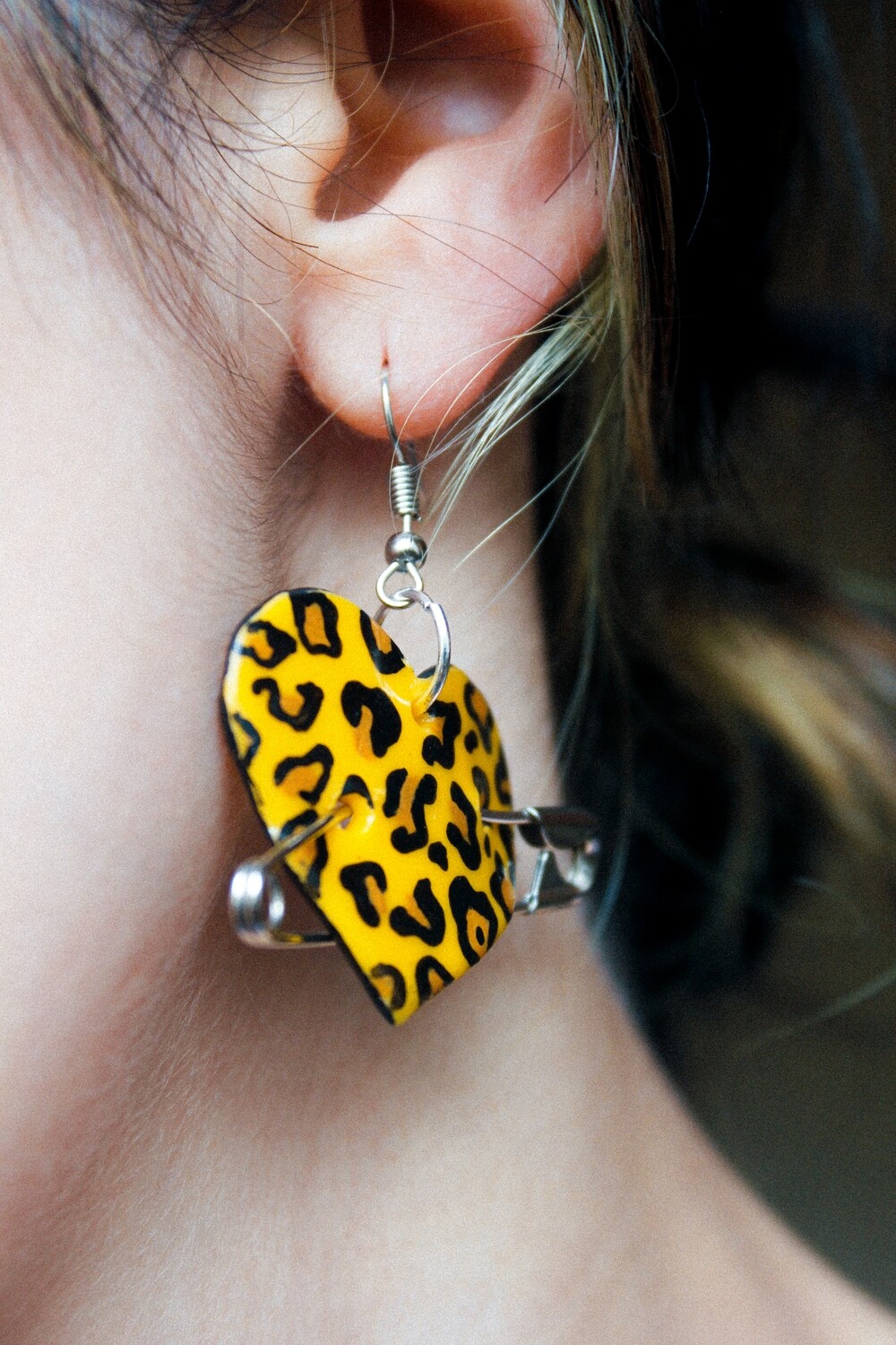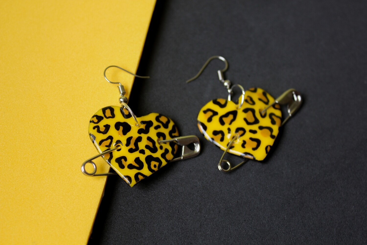 • Brincos em forma de coração com padrão de pele de leopardo amarelo e preto e alfinetes de segurança.