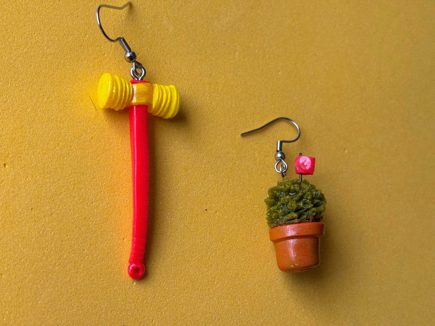 Brincos de São João, com um manjerico e um martelo esculpidos à mão.