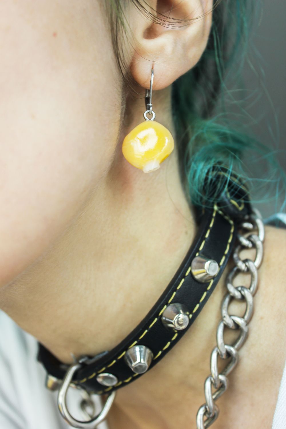 • Brinco amarelo e branco pendente na orelha com colar de couro preto e corrente metálica