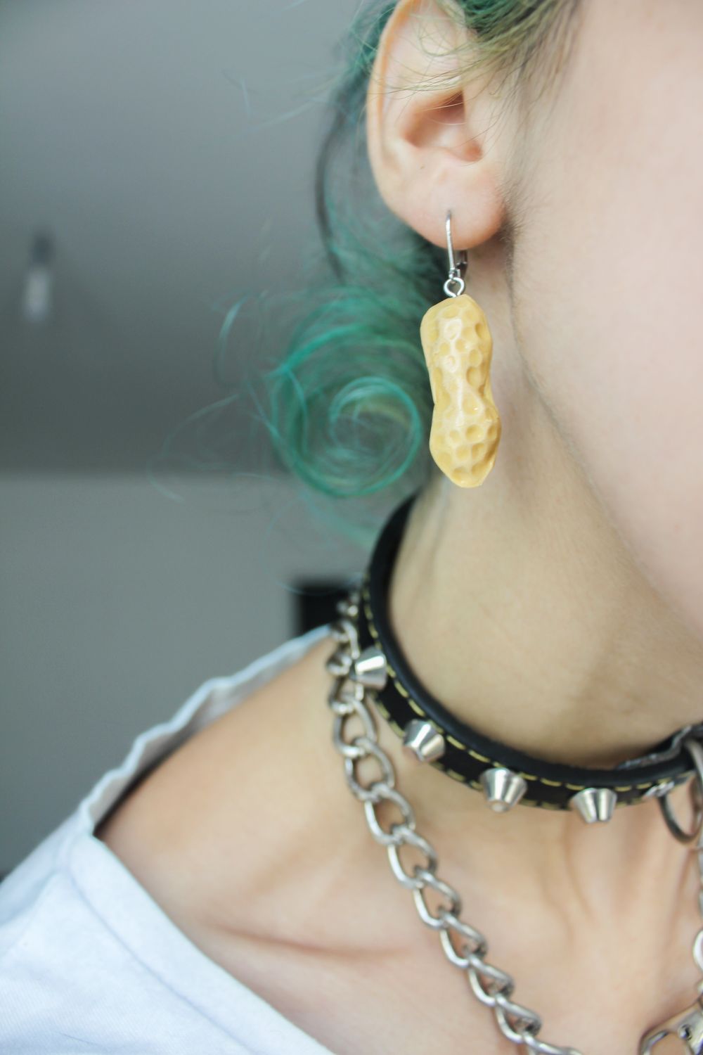 • Brinco pendente em forma de amendoim com colar preto de tachas e corrente prateada