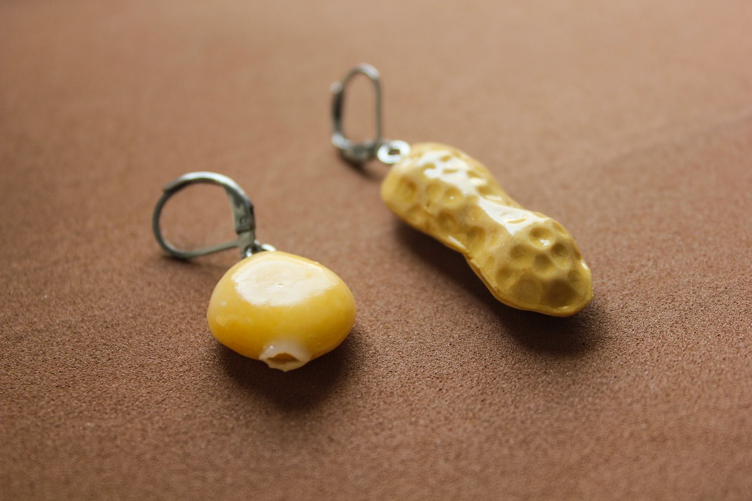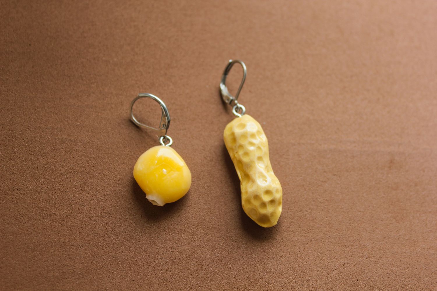 • Brincos com pingentes de amendoim e milho amarelos com argolas prateadas