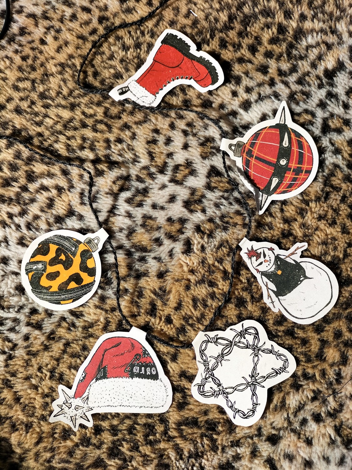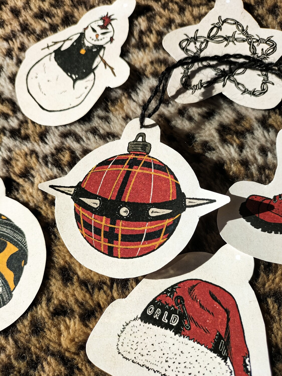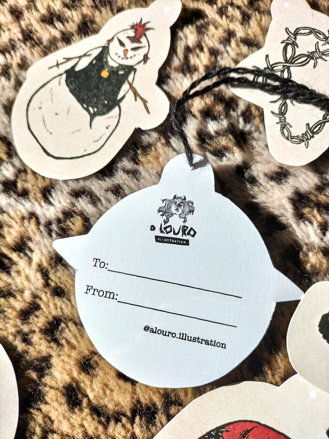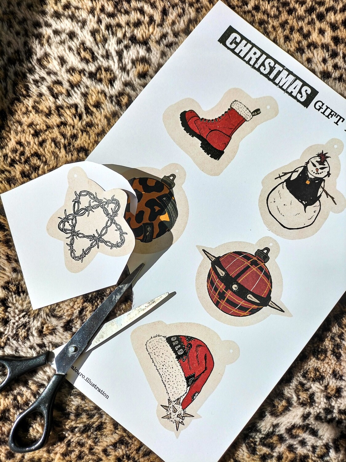 • Etiquetas de Natal com desenhos punk em folha branca sobre tecido pele de leopardo e uma tesoura preta.