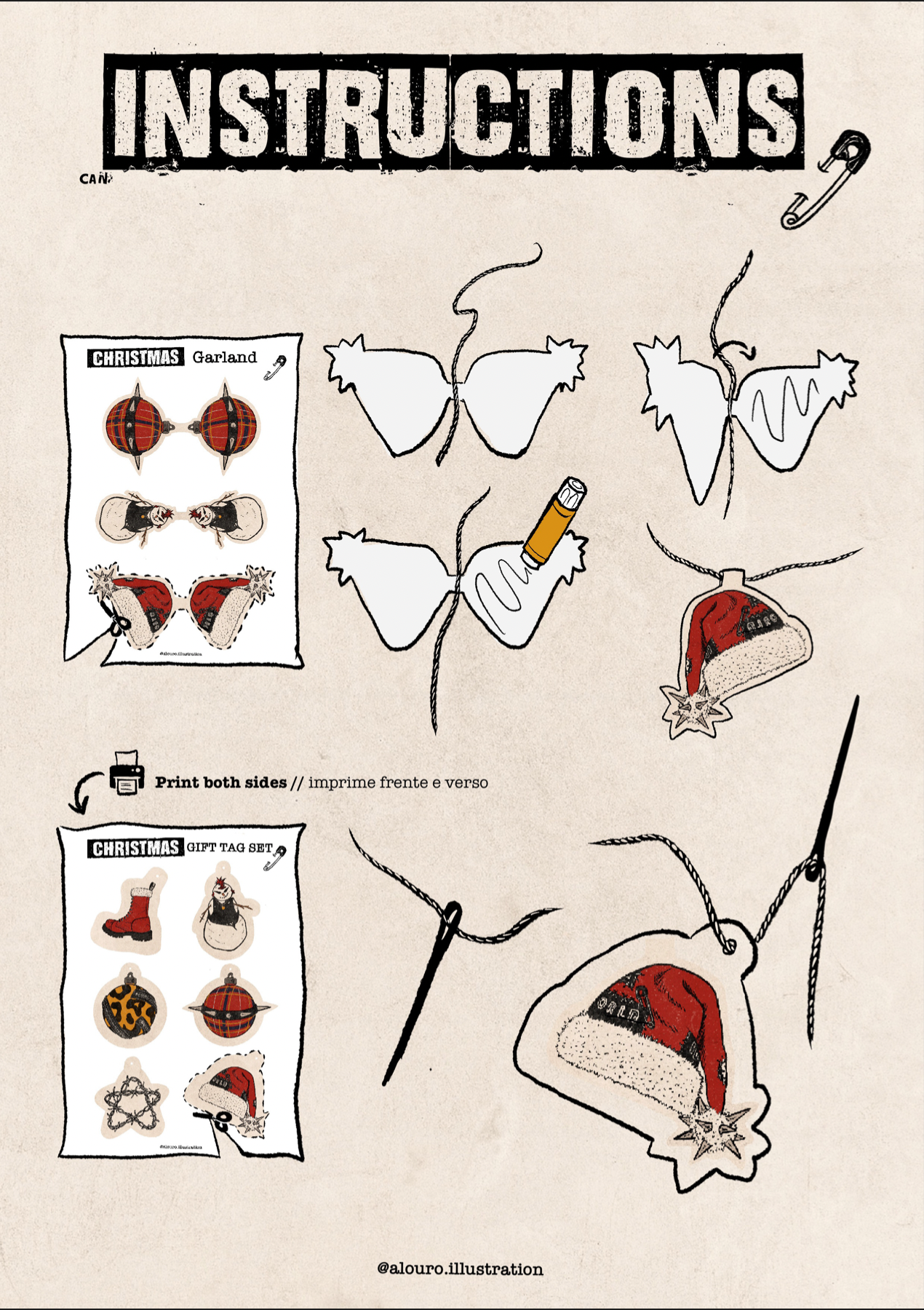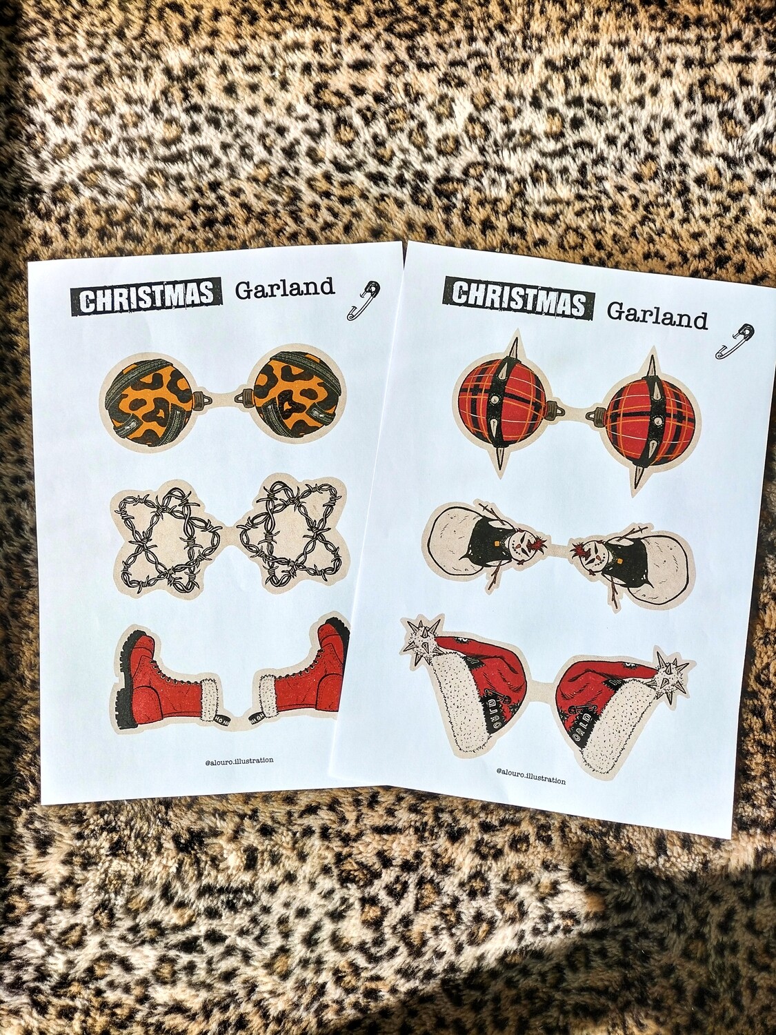 • Duas folhas com desenhos de enfeites natalícios para guirlandas em fundo animal print.