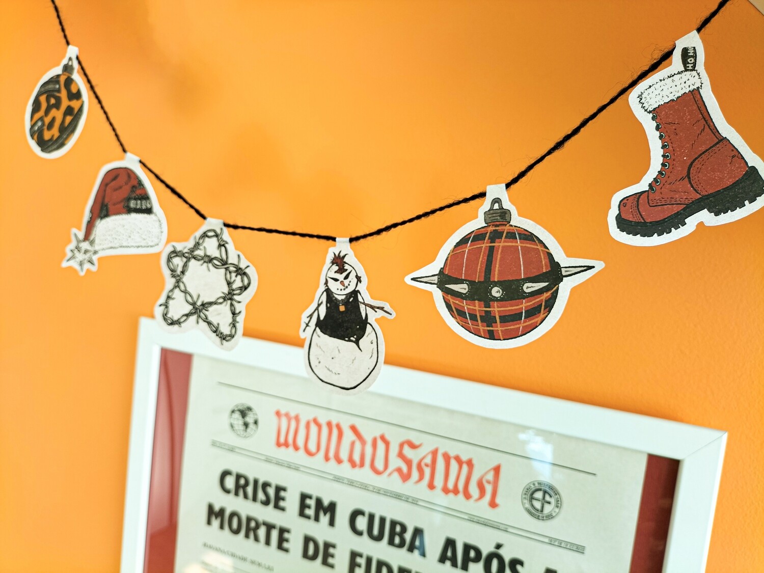 • Decoração de recortes de desenhos natalinos pendurados em fio preto na parede laranja.