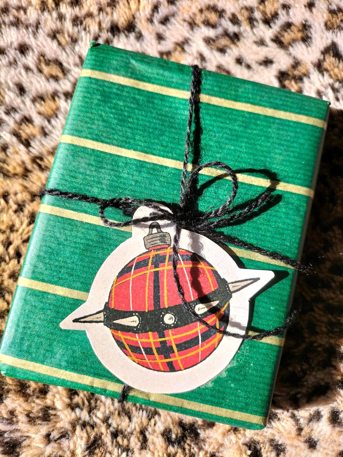 • Caixa embrulhada verde com etiqueta de bola de Natal vermelha xadrez