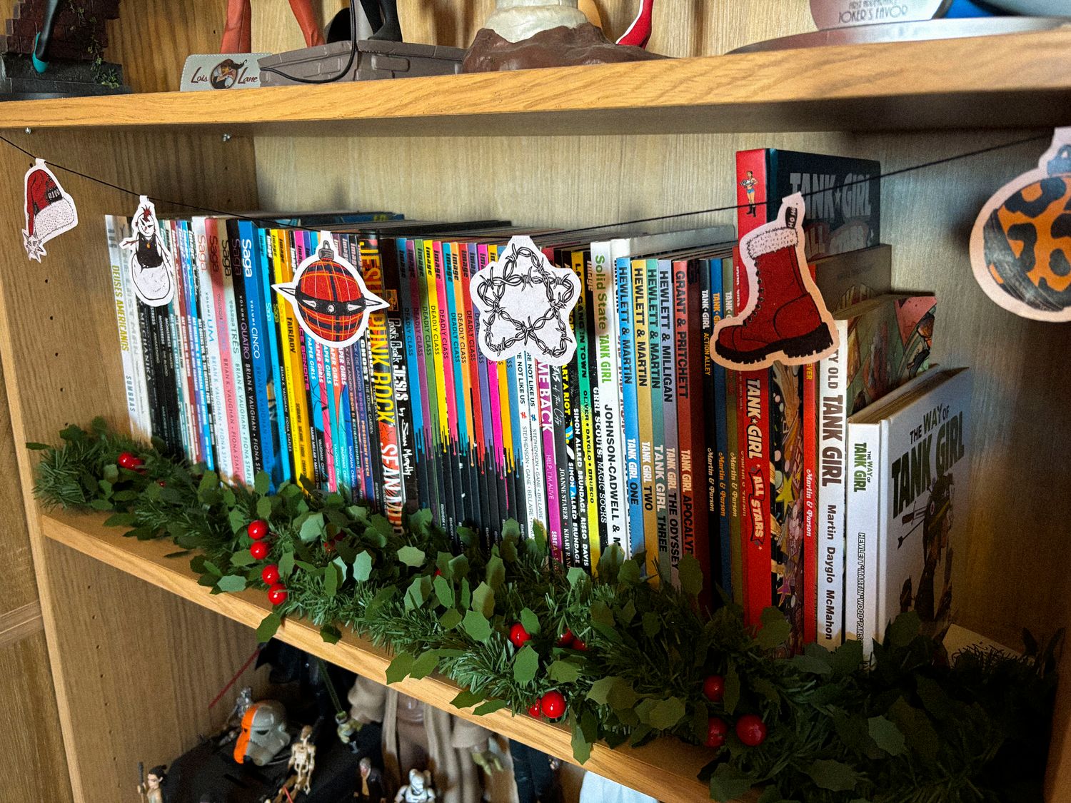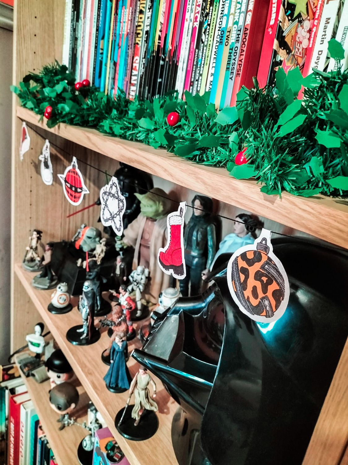 • Estante com figuras de ação de Star Wars e guirlanda verde com frutas vermelhas, livros coloridos e decoração natalícia pendurada