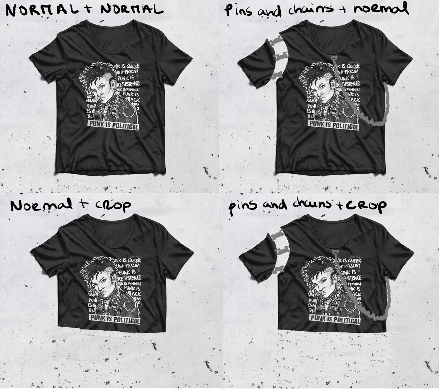 NORMAL// a t-shirt básica com a impressão, sem alterações. CORRENTES // Esta opção vem com alfinestes e correntes que podes remover e usar de várias maneiras. O tamanho standard da corrente é de 1 metro, se quiseres maior, deixa nos comentários quando finalizares a tua encomenda. CURTA // Podes mudar a tua t-shirt para um crop top com esta opção. O tamanho do crop é 30cm da gola e 40cm dos ombros. Podes escolher esta opção, tanto na t-shirt normal como na t-shirt de correntes. Se por algum motivo preferires um tamanho maior diz-me nos comentários da encomenda. Como as correntes e o corte são uma edição especial feitas à mão por mim, vai demorar mais a ser enviada. Dado que só começam a ser feitas depois de fazeres a tua encomenda. Pode demorar até 5 dias em produção.